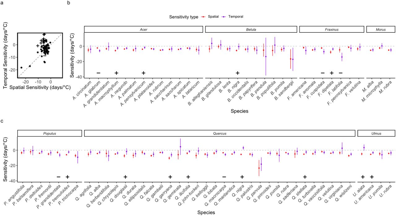 - We compared spatial and temporal sensitivities in multiple wind-pollinated species to evaluate the roles of plasticity and adaptation in phenological responses of flowering.
