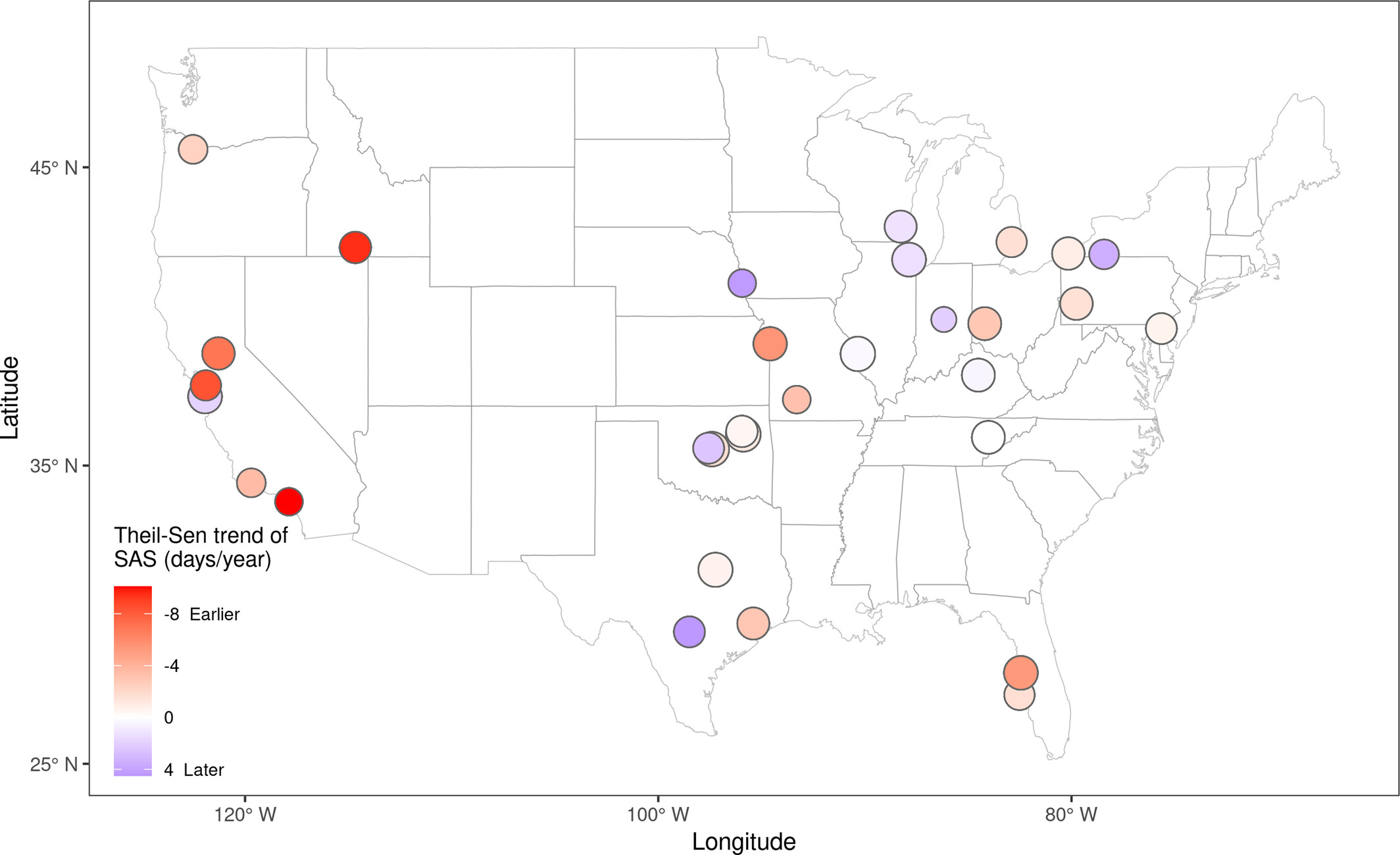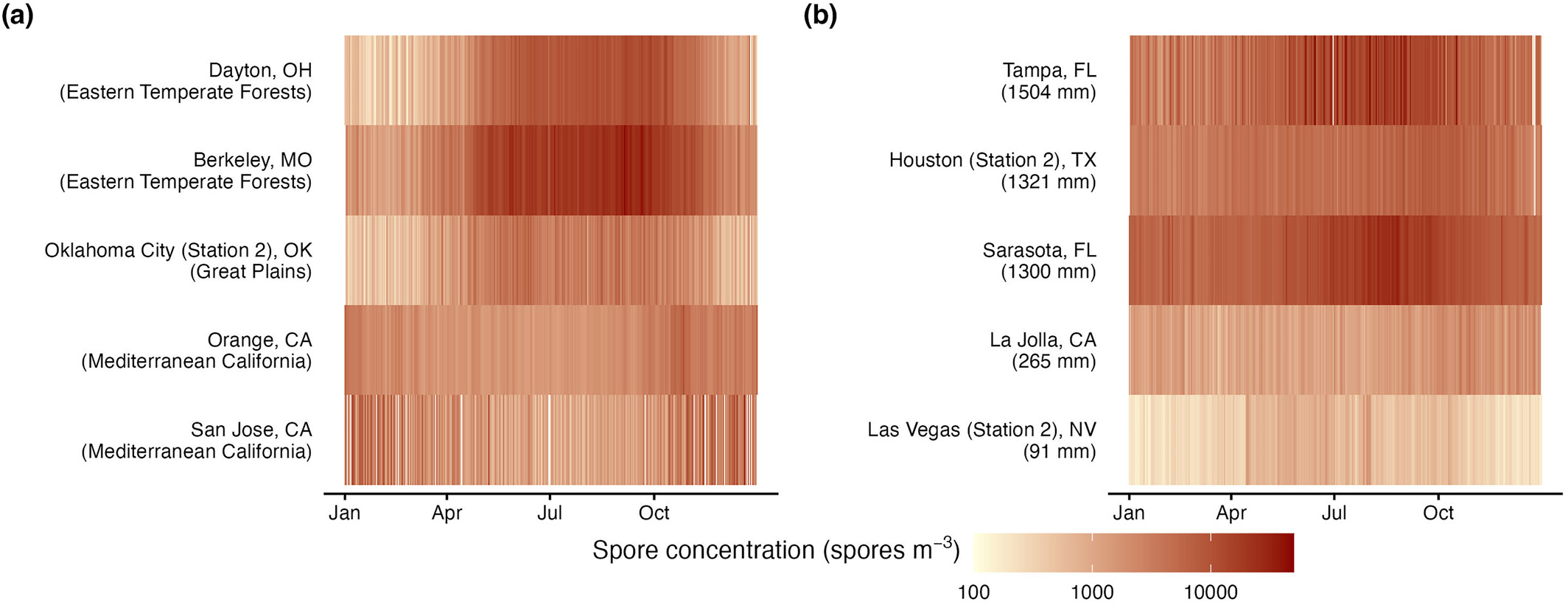 - In the United States, the onsets of both ecological and allergenic fungal spore seasons advanced from 2003 to 2022, with declined intensity.